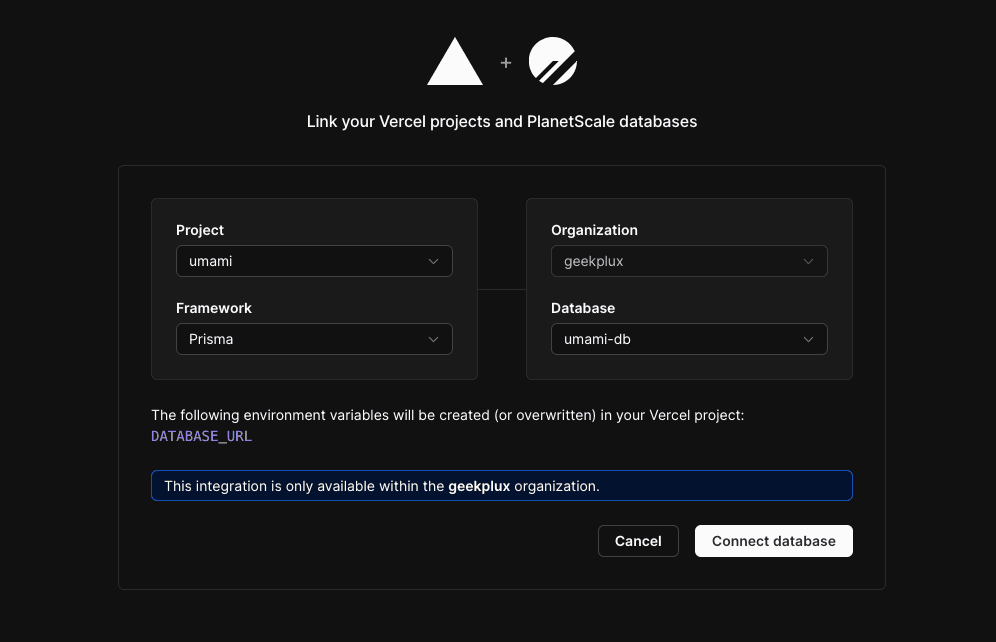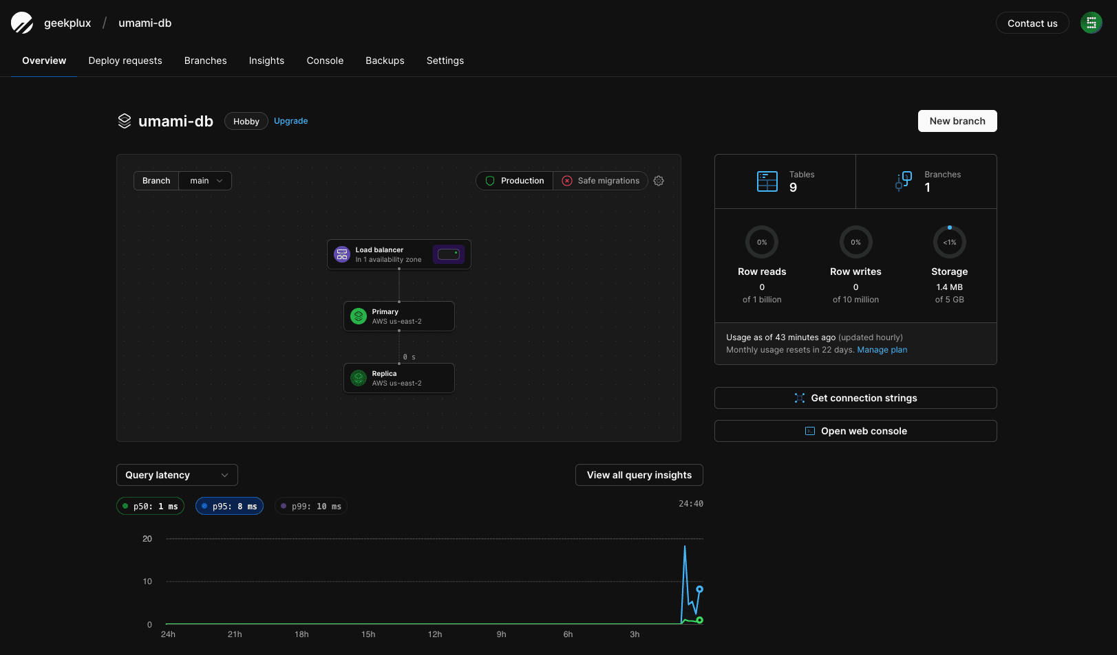 Before you start, you need to create an Umami database on PlanetScale . This will store your site’s analytics data that Umami will collect.